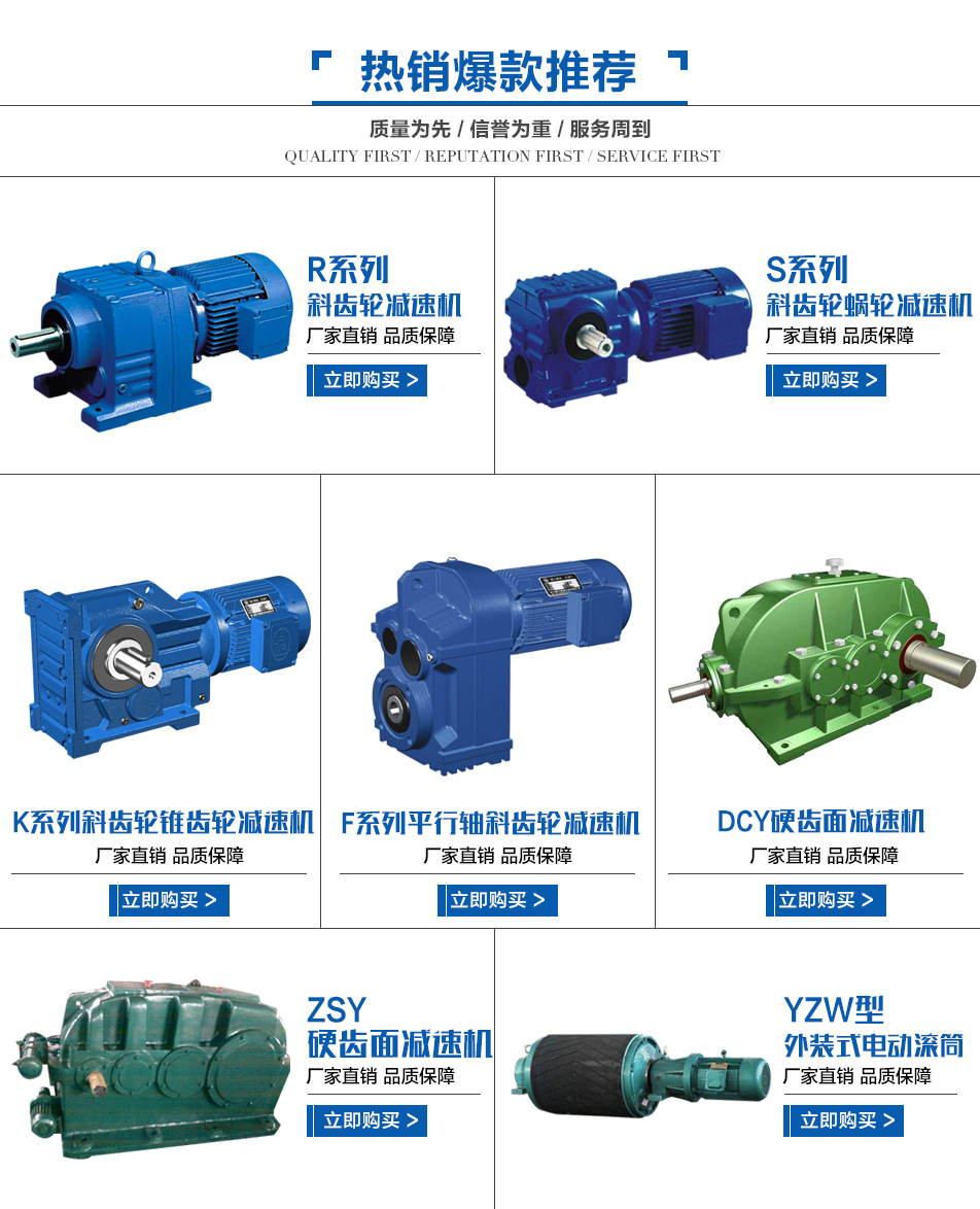 我廠主打產品為R、S、K、F系列斜齒輪減速機,ZSY、ZLYJ、ZD重型齒輪減速機,B、X系列擺線針輪減速機,WP、NMRV蝸輪蝸桿減速機,P系列行星減速機,TDY電滾筒及各種非標減速機.廣泛應用于制金.包裝,紡織,塑料機械,化工.電工機械等眾多行業。